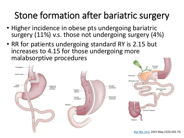 O paciente após a cirurgia bariátrica tende a ter redução do volume urinário. De uma média de 2100ml de urina por dia, a média cai para algo em torno de 750ml por dia. Esse fator por si só já aumenta a chance de formação de cálculos.